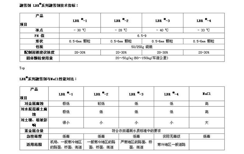 LBR-2具有冰點低(-28℃);融雪速度、效果優于原鹽;對金屬和水泥混凝土的腐蝕比原鹽降低70% 以上;對土壤、植被的損害比原鹽降低50%以上等特點。是原鹽的中檔替代品,適用在一般寒冷地區的道路上。
